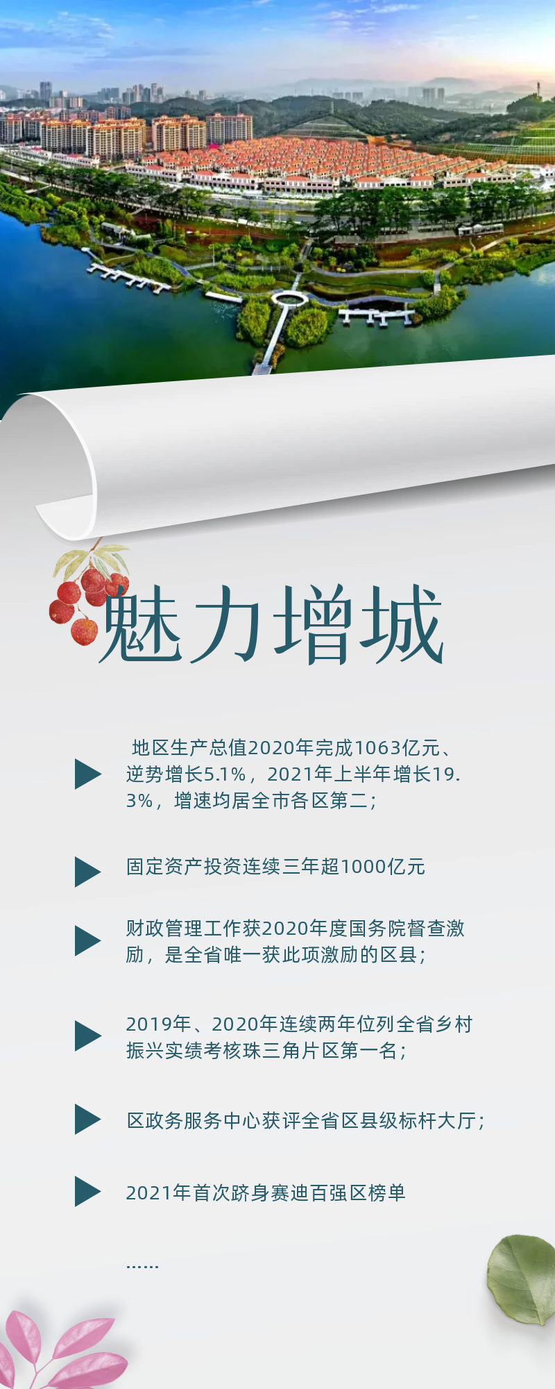 当前,增城正牢牢把握粤港澳大湾区建设、深圳先行示范区建设“双区驱动”的重大发展机遇,全力打造宜居宜业宜养宜游优质生活圈和现代化中等规模生态城区。一个更有活力的增城正在蓬勃发展,吸引更多投资者、企业家走进来!