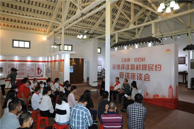 26日,“道德评议暨村规民约宣讲座谈会”在三乡镇白石村白石环人民会堂举行。村民们围坐在一起,共话村容村貌变化,探讨今后如何守好村规民约。