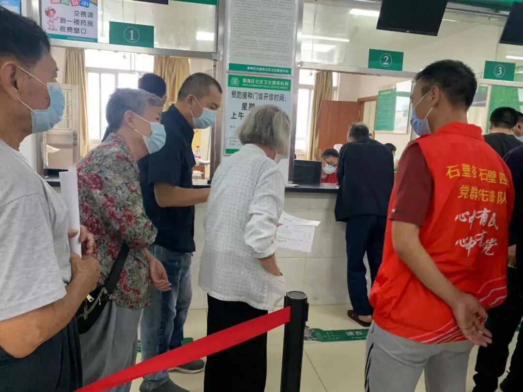 番禺区石壁街各村居结合党员下沉居住地活动,积极发动居住地党员到新冠疫苗接种点参与联系群众志愿服务。